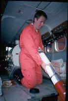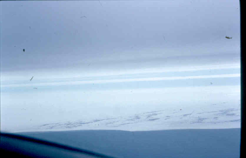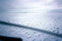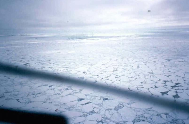 After fuelling at Fossil Bluff at 1200 we headed west at 12000 feet with 8/8 cloud tops below us. However this cleared further west and we approached the first drop area at 1415 with the ice edge clearly visible ahead. Unfortunately, on crossing the edge, the pack was seen to consist of a compact mass of small (10-20m) floes with a lot of brash in between - we estimated 50% solid ice and 50% brash/open water. We continued for 30 mins (60 nm) but there was little change in conditions. As we were approaching our "point of no return" we decided to make the first drop. CALIB 21388 was deployed at 1810 UTC at 70 53S, 87 23W from 1000'. We then turned for our return flight and deployed CALIB 21384 at 70 57S, 87 03W at 1825 UTC. We attempted to confirm that these drifters had landed on floes, but were unsuccessful due to poor contrast (8/8 cloud overhead).
