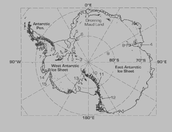 9. Dome Argus, 10. Transantarctic Mountains, 11. Byrd Glacier, 12. David